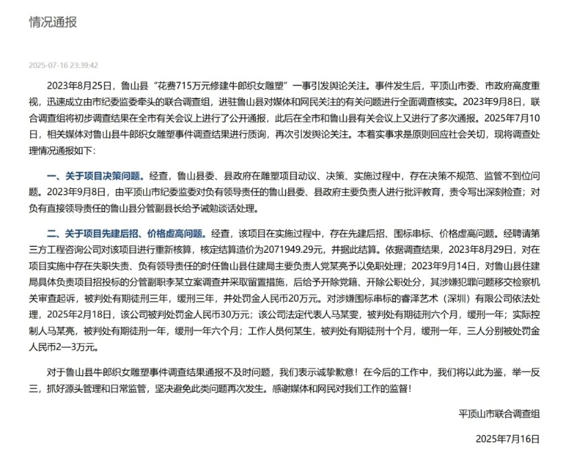 2023年8月25日,鲁山县“花费715万元修建牛郎织女雕塑”一事引发舆论关注。事件发生后,平顶山市委、市政府高度重视,迅速成立由市纪委监委牵头的联合调查组,进驻鲁山县对媒体和网民关注的有关问题进行全面调查核实。2023年9月8日,联合调查组将初步调查结果在全市有关会议上进行了公开通报,此后在全市和鲁山县有关会议上又进行了多次通报。2025年7月10日,相关媒体对鲁山县牛郎织女雕塑事件调查结果进行质询,再次引发舆论关注。本着实事求是原则回应社会关切,现将调查处理情况通报如下: