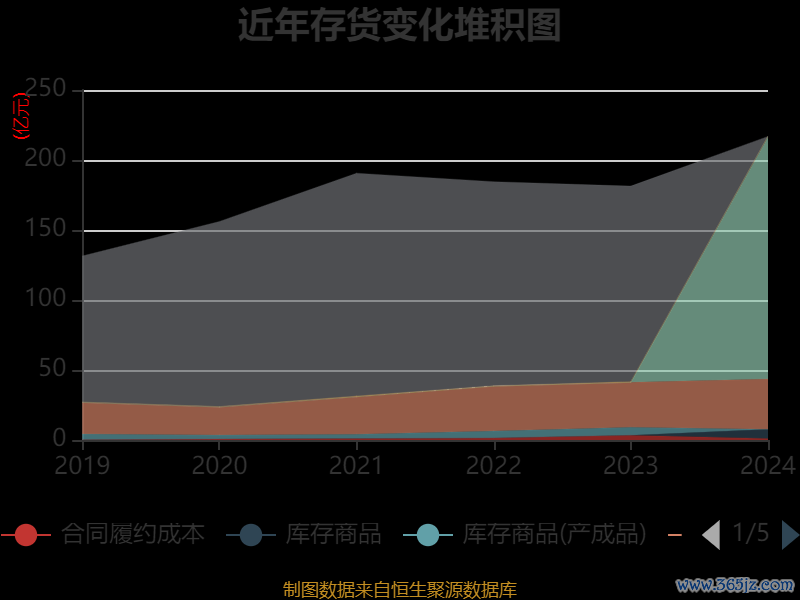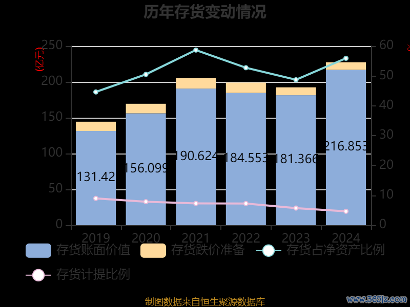 从存货变动来看,截至2024年末,公司存货账面价值为216.85亿元,占净资产的55.9%,较上年末增加35.49亿元。其中,存货跌价准备为10.55亿元,计提比例为4.64%。