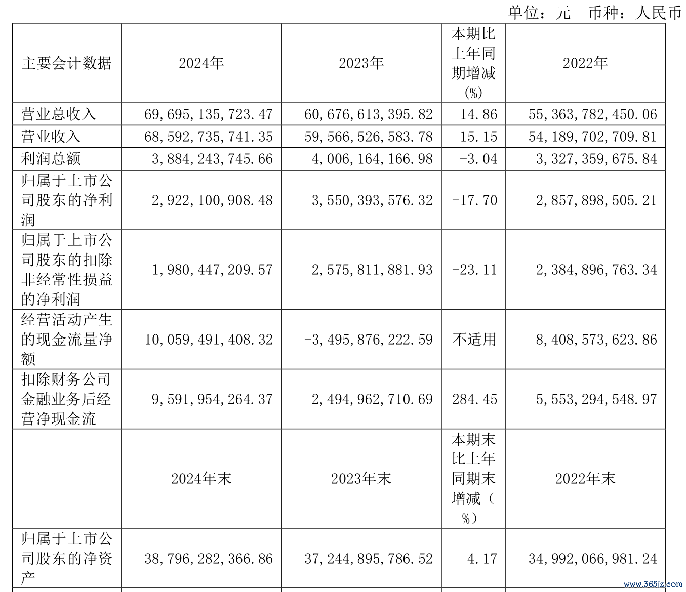 资产重大变化方面,截至2024年末,公司货币资金较上年末增加56.78%,占公司总资产比重上升4.77个百分点;预付款项较上年末减少25.79%,占公司总资产比重下降2.4个百分点;债权投资较上年末增加3.74%,占公司总资产比重下降1.82个百分点;发放贷款和垫款较上年末减少20.19%,占公司总资产比重下降1.48个百分点。