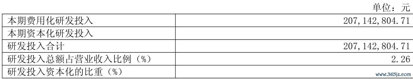 2024年全年,公司研发投入金额为2.07亿元,同比增长14.11%;研发投入占营业收入比例为2.26%,相比上年同期上升0.58个百分点。此外,公司全年研发投入资本化率为0%。
