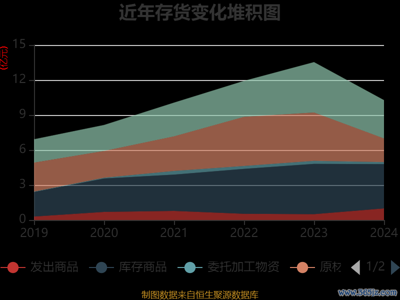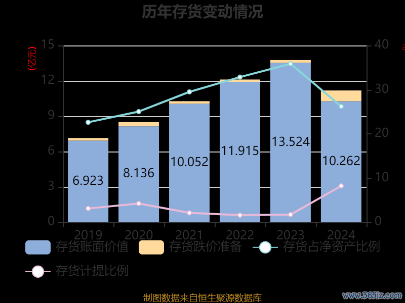 从存货变动来看,截至2024年末,公司存货账面价值为10.26亿元,占净资产的26.2%,较上年末减少3.26亿元。其中,存货跌价准备为9176.02万元,计提比例为8.21%。