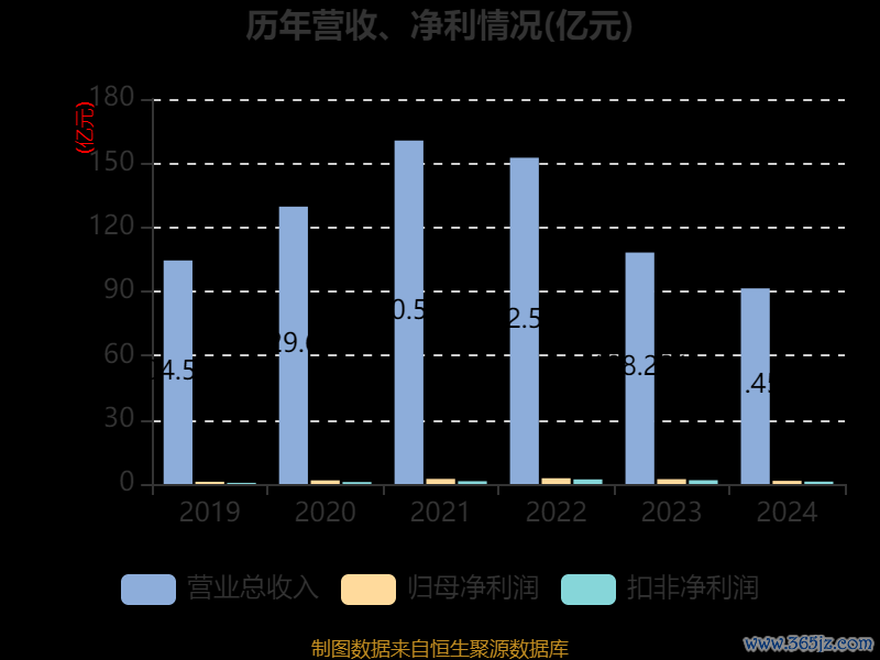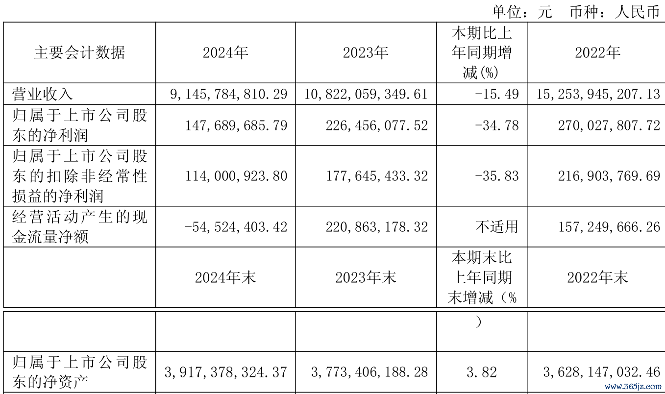 中证智能财讯有研新材(600206)4月30日披露2024年年度报告。2024年,公司实现营业总收入91.46亿元,同比下降15.49%;归母净利润1.48亿元,同比下降34.78%;扣非净利润1.14亿元,同比下降35.83%;经营活动产生的现金流量净额为-5452.44万元,上年同期为2.21亿元;报告期内,有研新材基本每股收益为0.174元,加权平均净资产收益率为3.90%。公司2024年度分配预案为:拟向全体股东每10股派现1.09元(含税)。